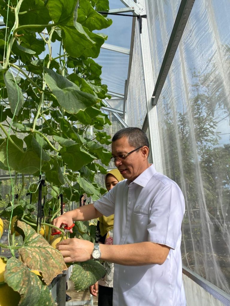 Sementara itu, Reno Pati, pengelola kebun dan asrama UNTAN, menjelaskan bahwa optimalisasi lahan asrama diwujudkan melalui pembangunan kebun melon premium di dalam greenhouse. Saat ini, terdapat lebih dari 500 batang melon yang ditanam dengan dua varietas unggulan, yaitu Melon The Blues dan Melon Inthanon.