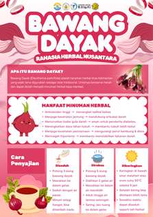 Bawang Dayak dikenal memiliki kandungan senyawa bioaktif seperti flavonoid, tanin, dan alkaloid. Senyawa tersebut berkhasiat sebagai antioksidan, antiinflamasi, serta antidiabetes. Potensi tersebut menjadikan Bawang Dayak sebagai salah satu alternatif pengobatan berbasis herbal yang dapat dimanfaatkan masyarakat, terutama dalam upaya pencegahan penyakit degeneratif seperti hipertensi, diabetes melitus, dan gangguan jantung.